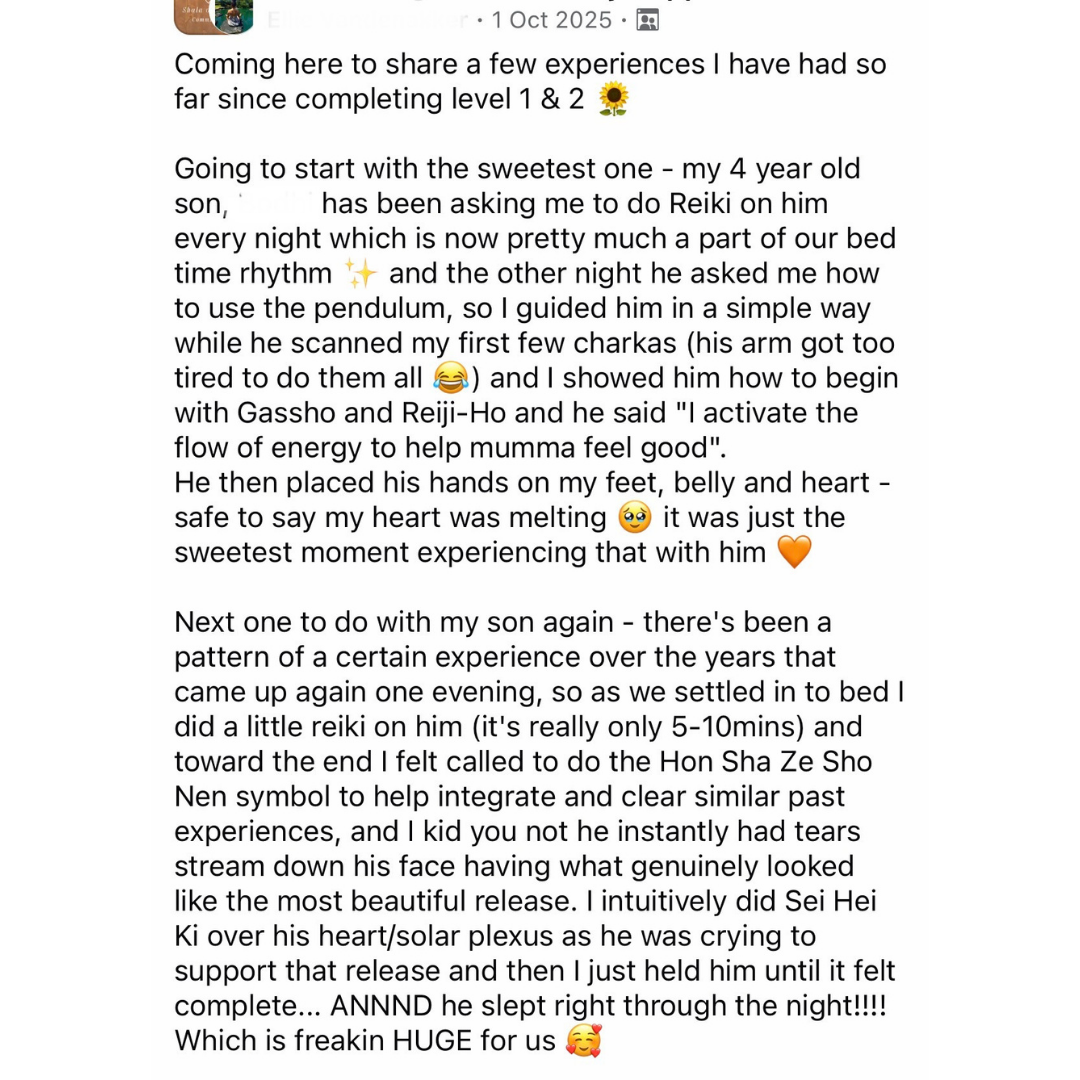 Reiki Attunements are a sacred process that aligns and opens your energy field with Reiki, enabling you to channel Reiki for self-healing and to support the healing of others.